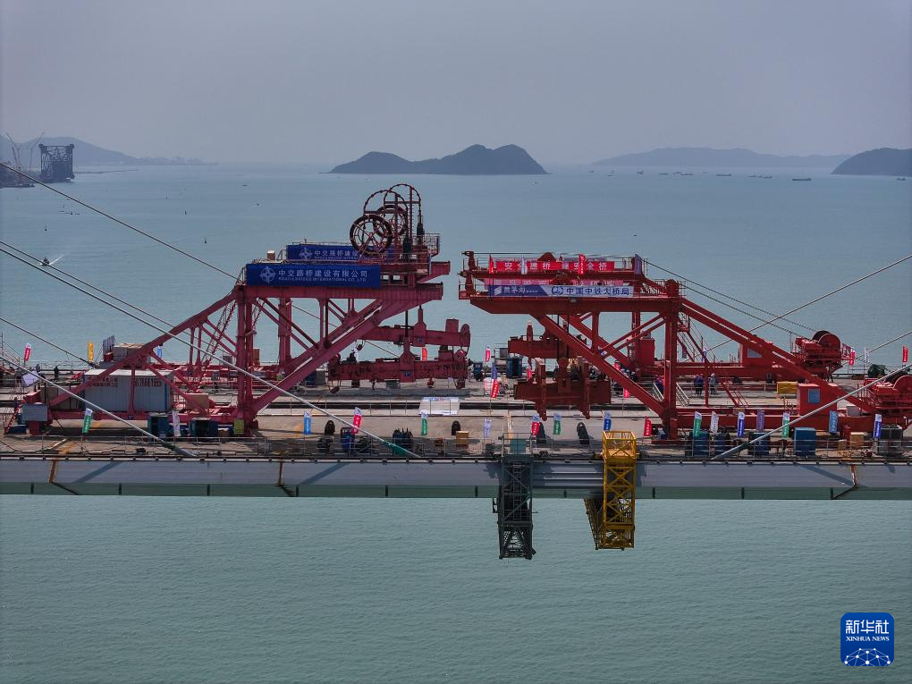 2024年3月20日,隨著高欄港大橋主跨合龍梁段的最后一段焊縫精準焊接,黃茅??绾Mǖ栏邫诟鄞髽蚝淆垼o人機照片)。