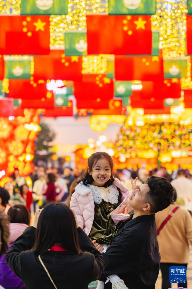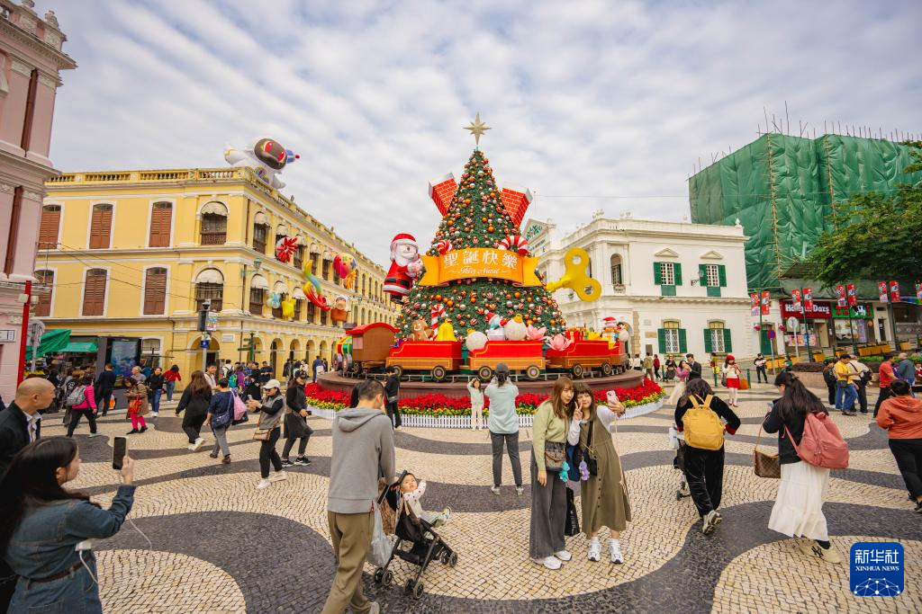 12月12日,游客在澳門議事亭前地的圣誕樹前拍照。