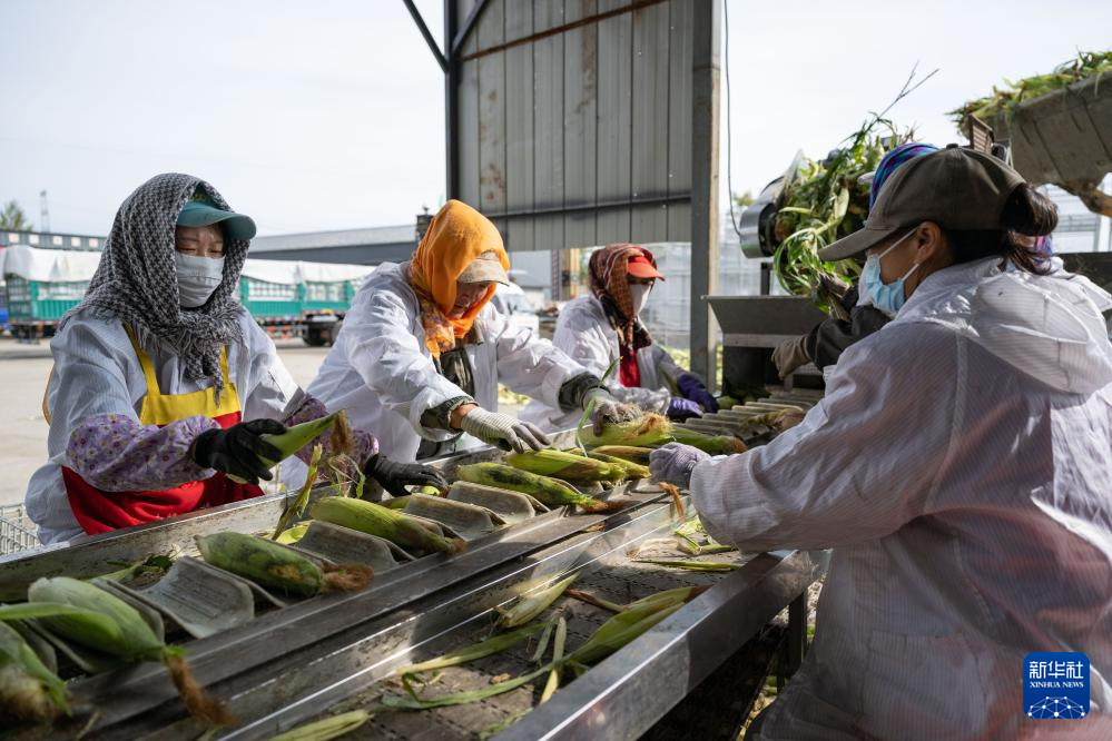 在黑龍江省雙鴨山市四方臺區,一家食品公司的工作人員在加工今秋收獲的玉米(9月25日攝)。