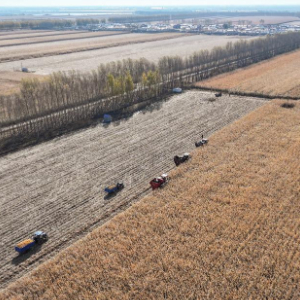 在黑龍江省肇東市五里明鎮東升村,農民駕駛農機進行收割作業(10月16日攝,無人機照片)。