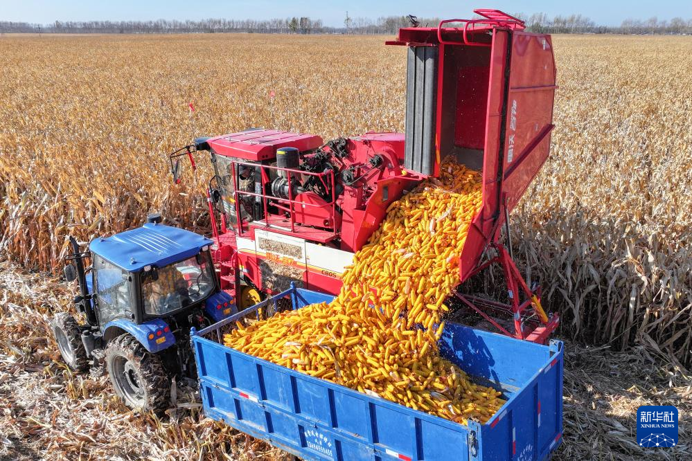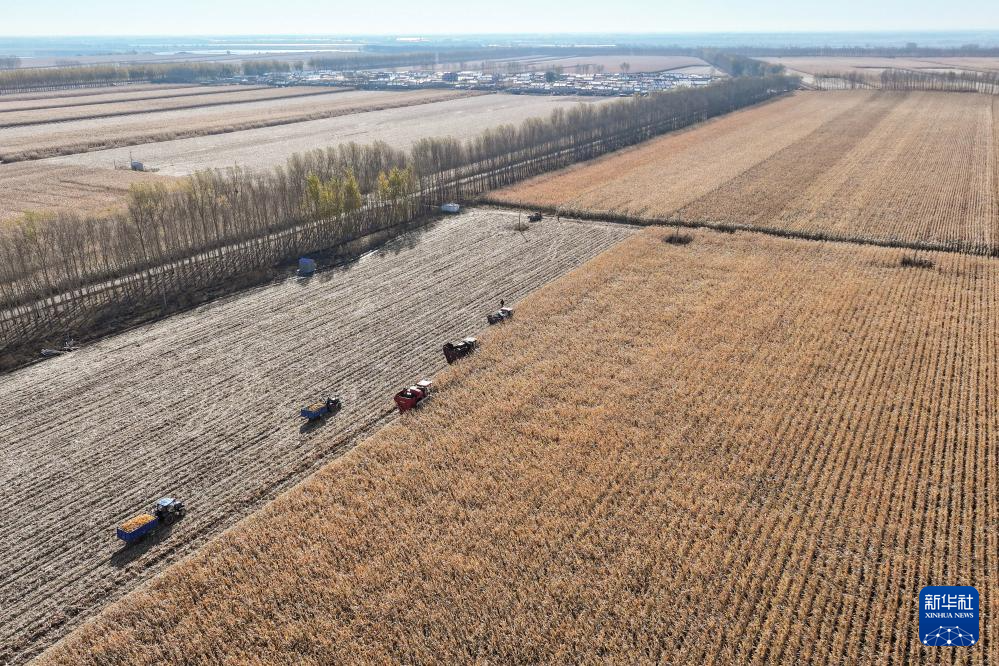 在黑龍江省肇東市五里明鎮東升村,農民駕駛農機收獲玉米(10月16日攝,無人機照片)。