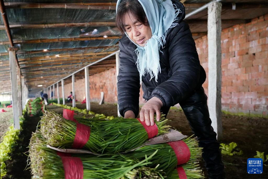 12月15日,河北省秦皇島市撫寧區留守營鎮一家蔬菜種植合作社的社員在大棚內采收韭菜。