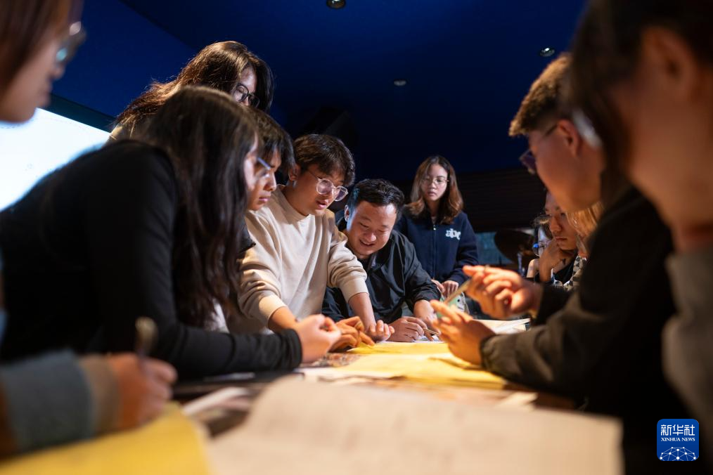 12月13日,在上圍村麥平藝術工作室,麥平(左)和搭檔袁琴在討論畫卷創作方案。新華社記者 伍志尊 攝pagebreak