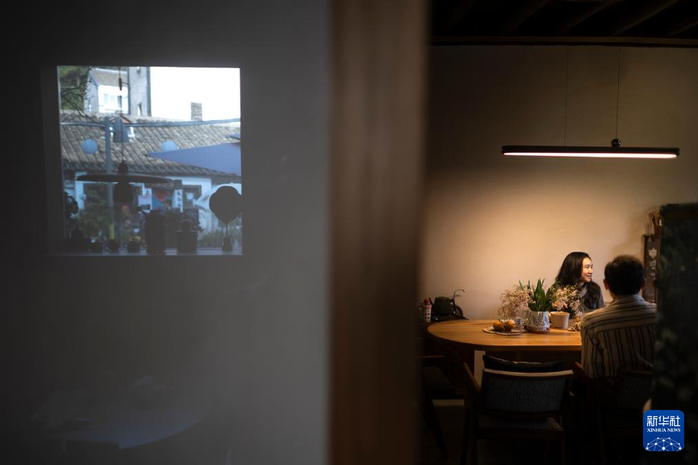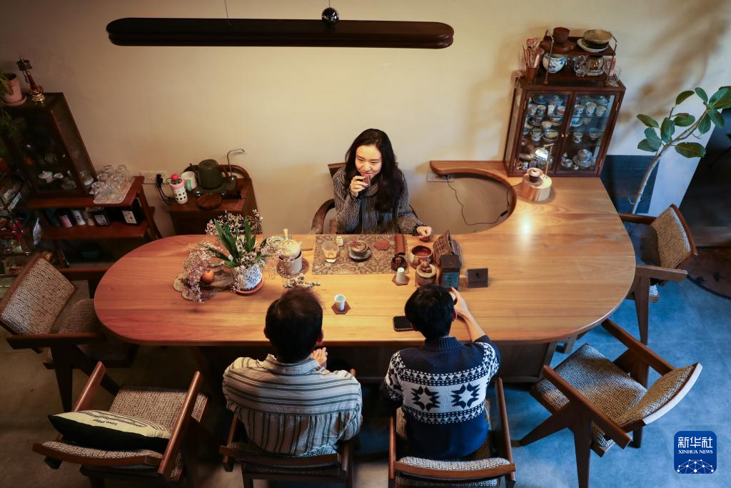 12月13日,在上圍村魚里茶空間,主理人黃煜(左)為客人泡茶。新華社記者 伍志尊 攝pagebreak