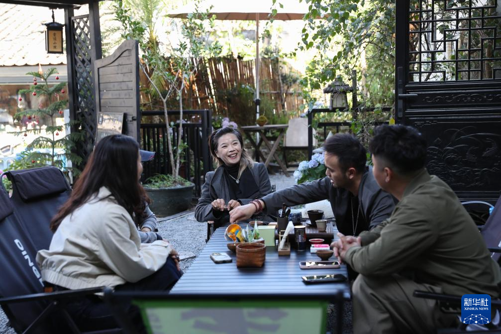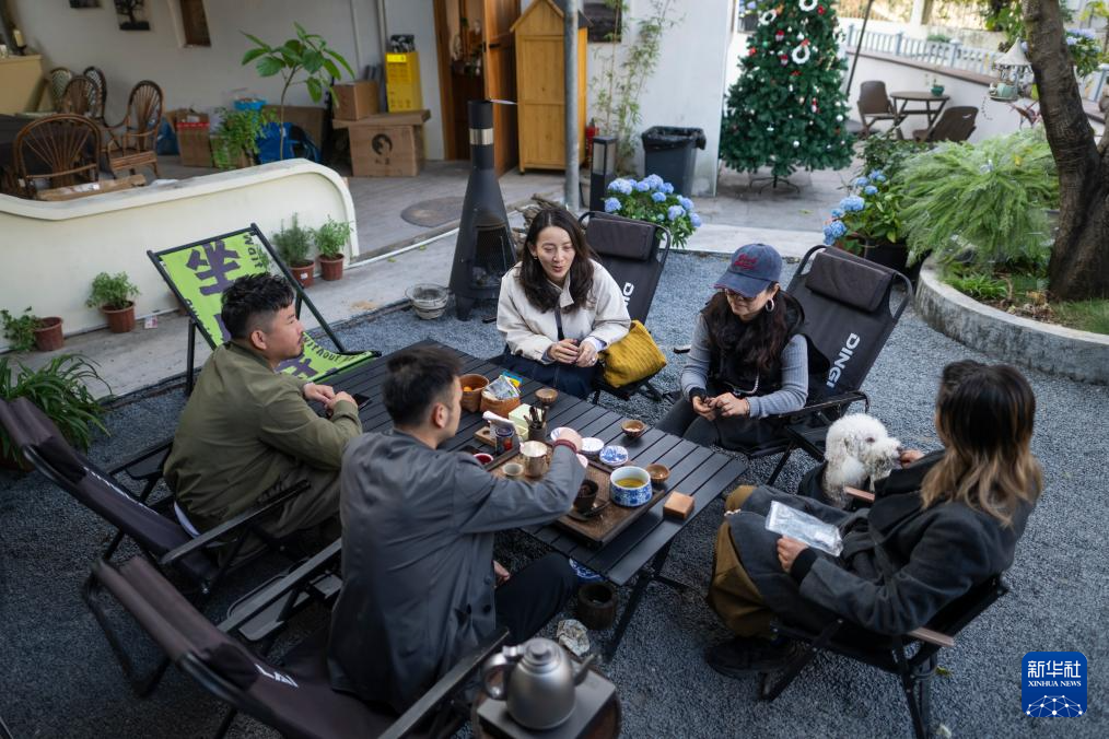12月13日,上圍村云頂小院工作室主理人王濤(右一)、高飛(右三)與鄰居們在小院里喝茶。新華社記者 王婧嬙 攝pagebreak