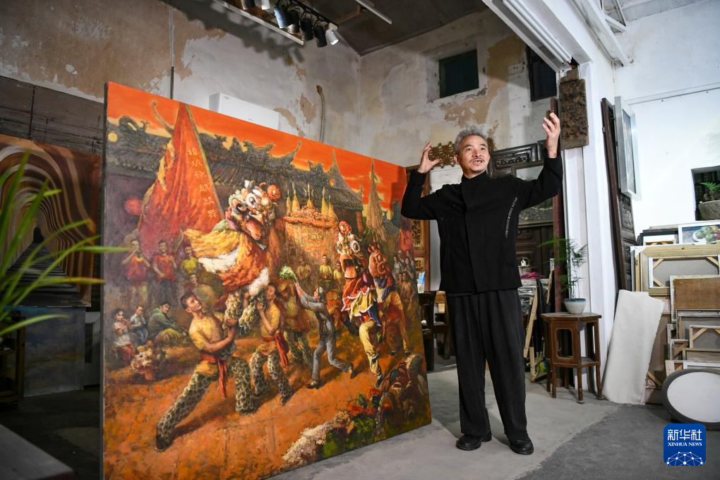 12月13日,在上圍村幽蘭坊工作室,藝術家唐文標為游客講解根據廣東非遺舞麒麟創作的油畫。新華社記者 梁旭 攝