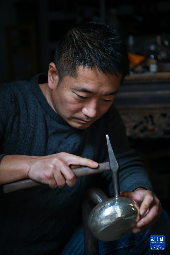 12月13日,在上圍村本堯堂工作室,主理人陳榮鴿在打制銀壺。新華社記者 梁旭 攝pagebreak