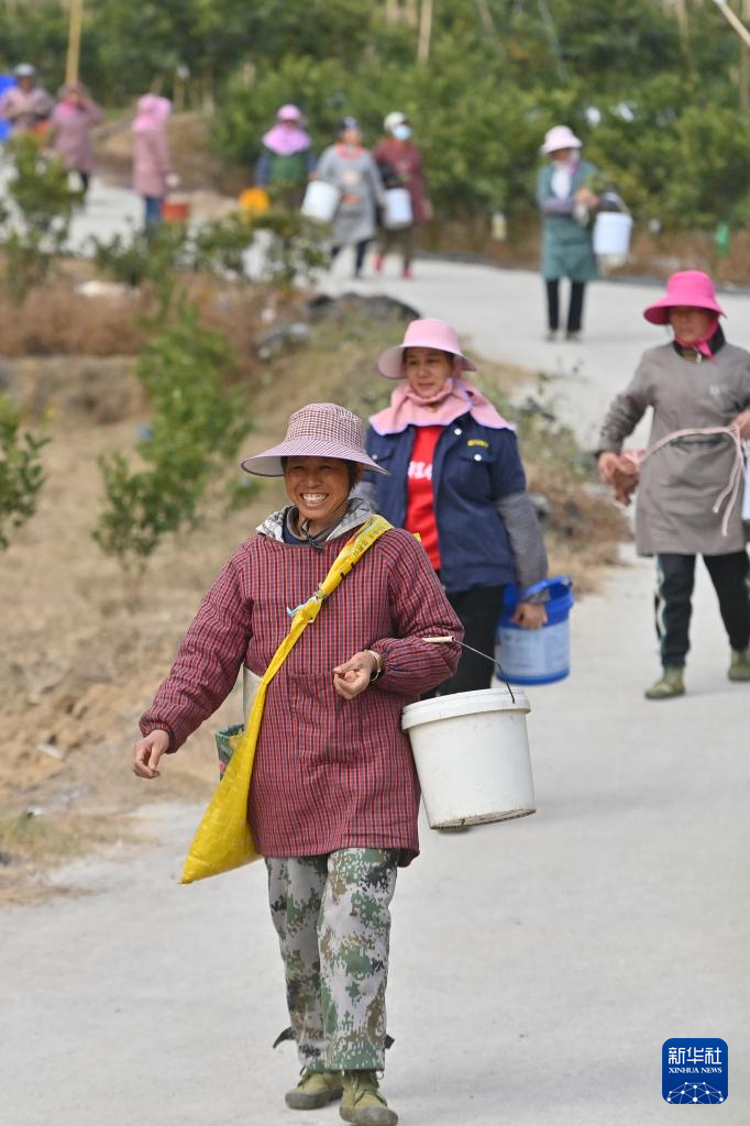 在柳州市柳江區土博鎮水源村,完成采摘工作的婦女們走出金桔園(12月18日攝)。