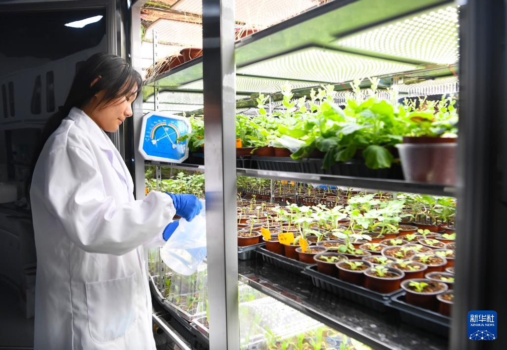 12月25日,在位于河南新鄉的中原農谷實驗室,中國農科院中原研究中心科研人員給植物光照培養箱內的樣本澆水。