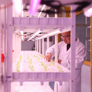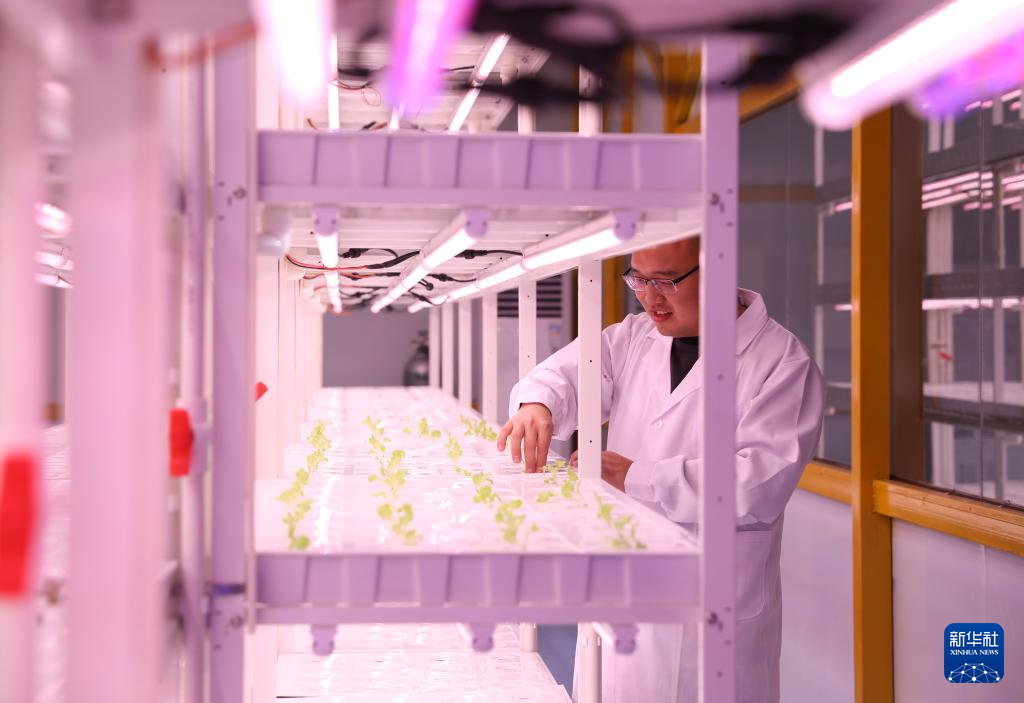 12月25日,在位于河南新鄉的中原農谷植物工廠,科研人員查看培育的生菜苗。