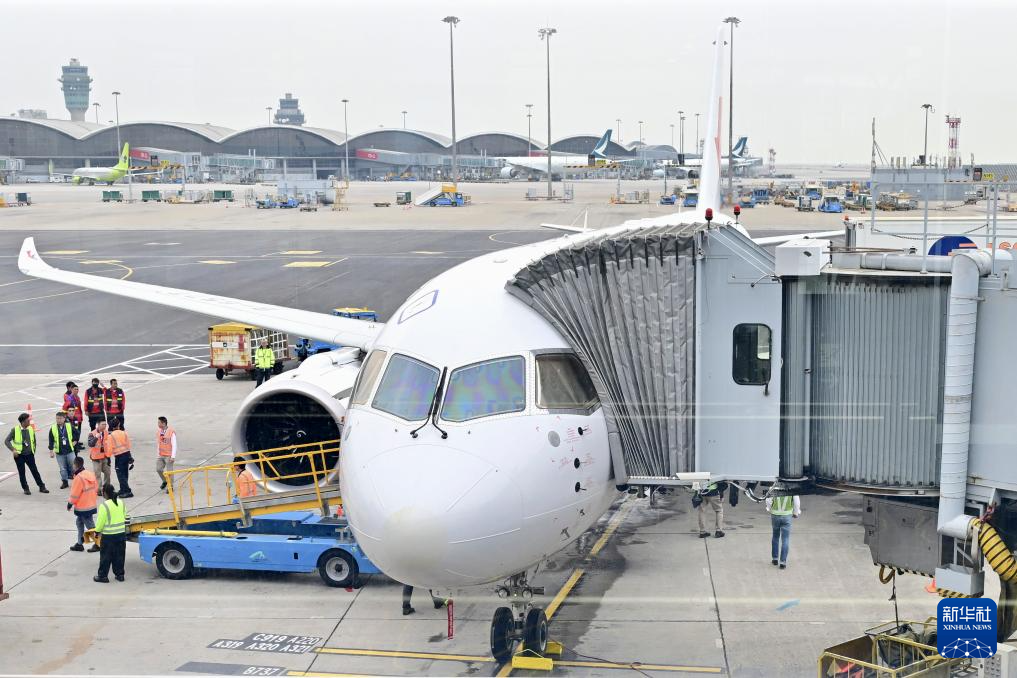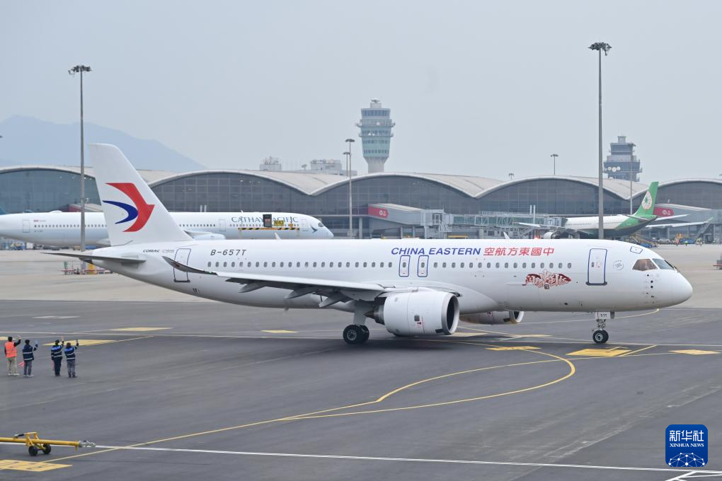 1月1日,乘客乘坐東航C919“上海虹橋—香港”MU721首航航班抵達香港。