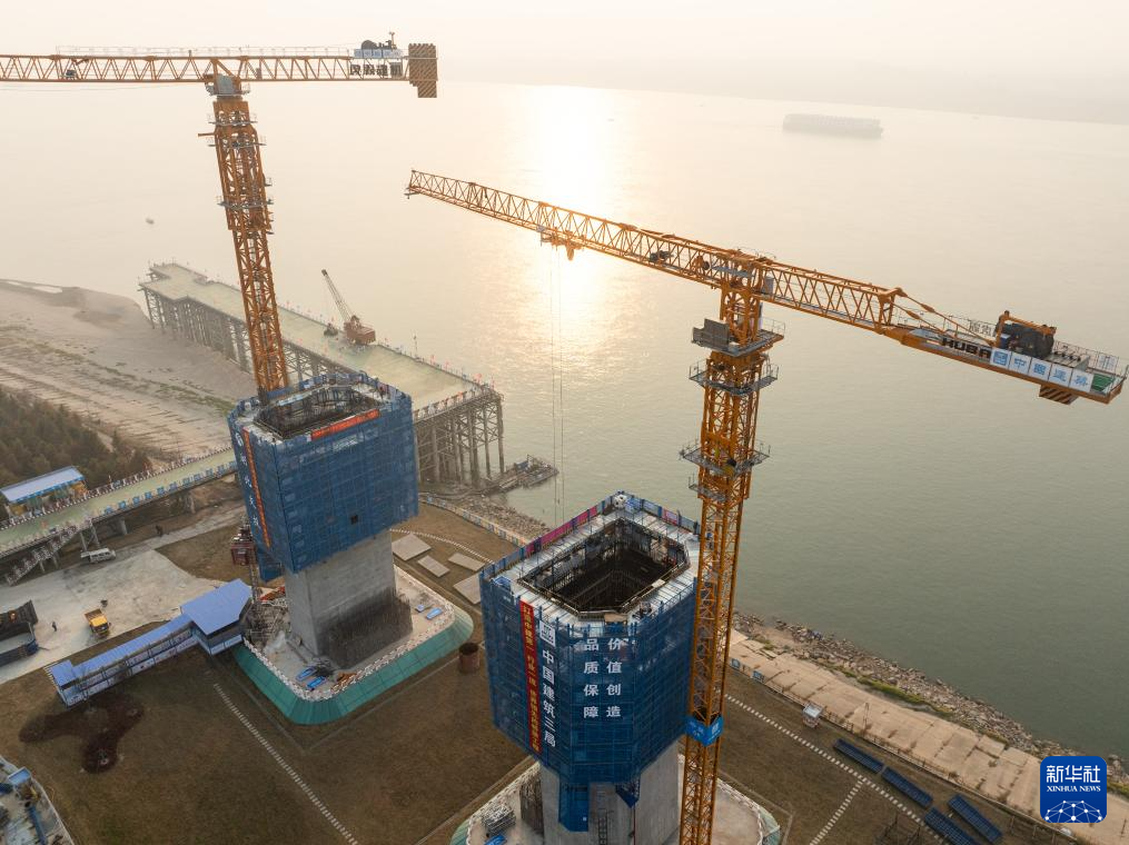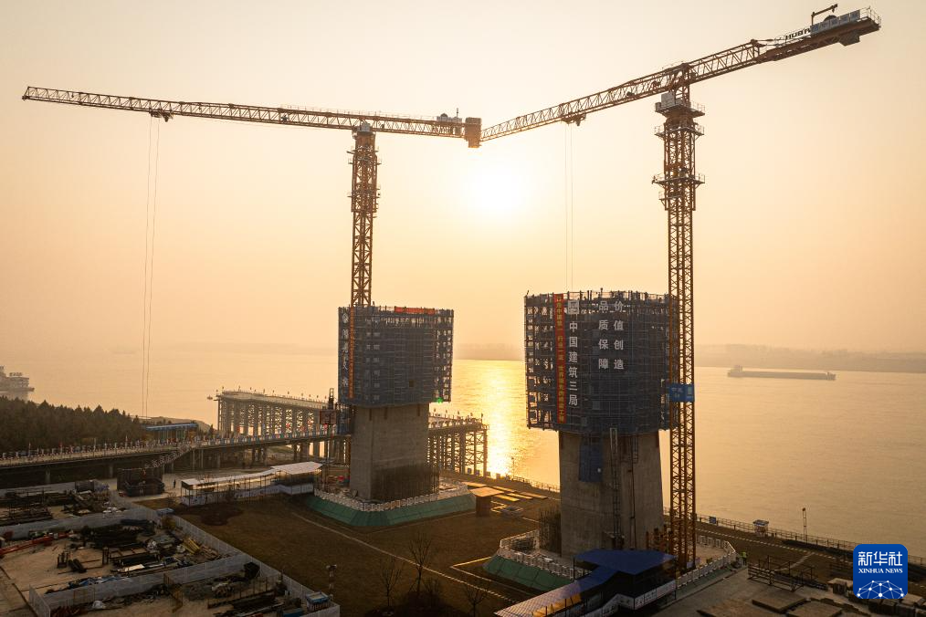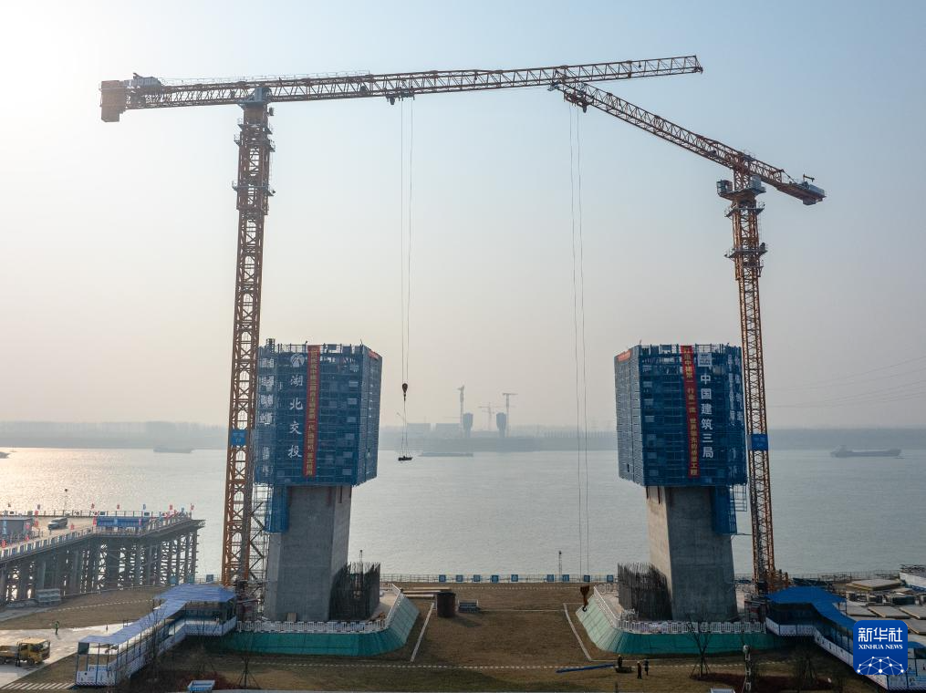 1月3日拍攝的湖北荊州李埠長江公鐵大橋項目現場新一代輕型智能“造塔機”(無人機照片)。