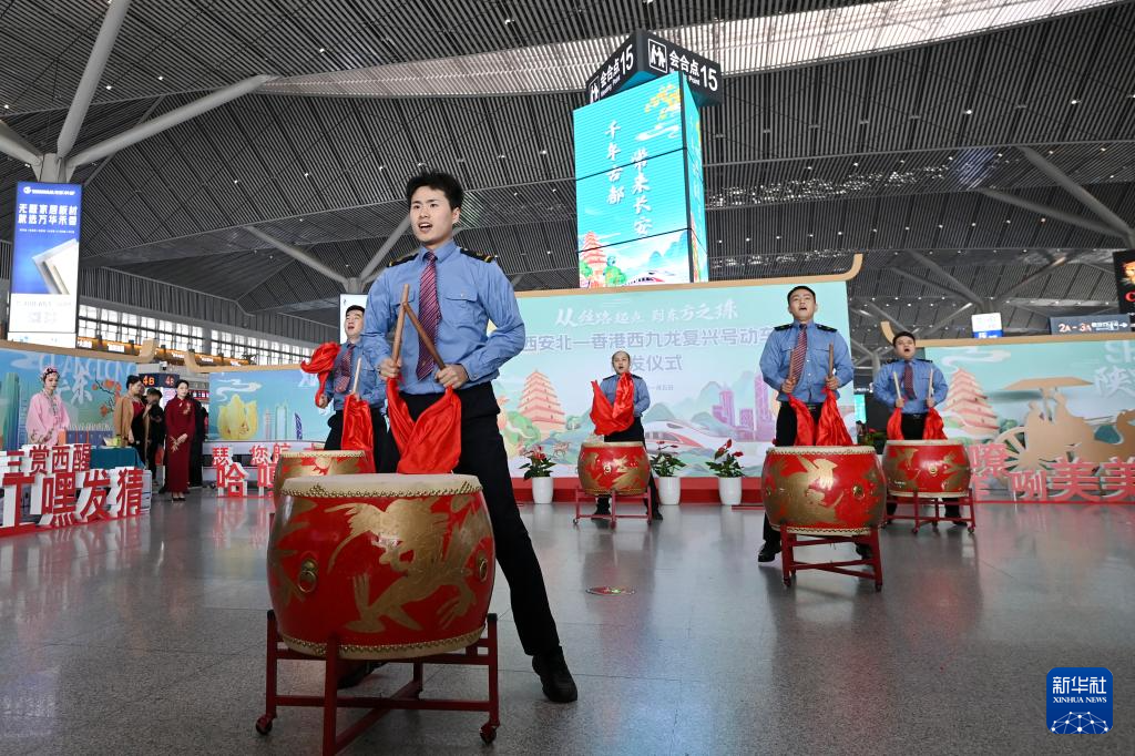 1月5日,在西安北站候車大廳,鐵路工作人員在西安北至香港西九龍復興號車首發儀式上為旅客表演。