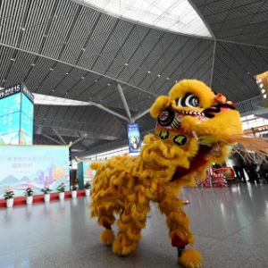 1月5日,在西安北站候車大廳,舞獅演員在西安北至香港西九龍復興號動車首發儀式上為旅客表演。