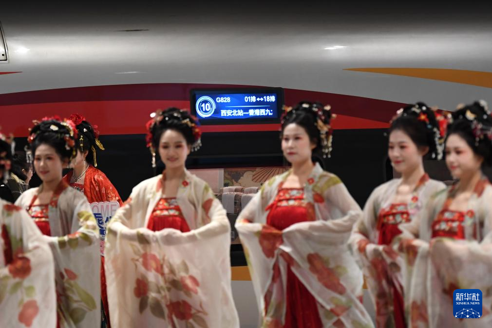 1月5日,在西安北站,身穿漢服的鐵路工作人員在西安北至香港西九龍復興號動車首發儀式上為旅客表演。