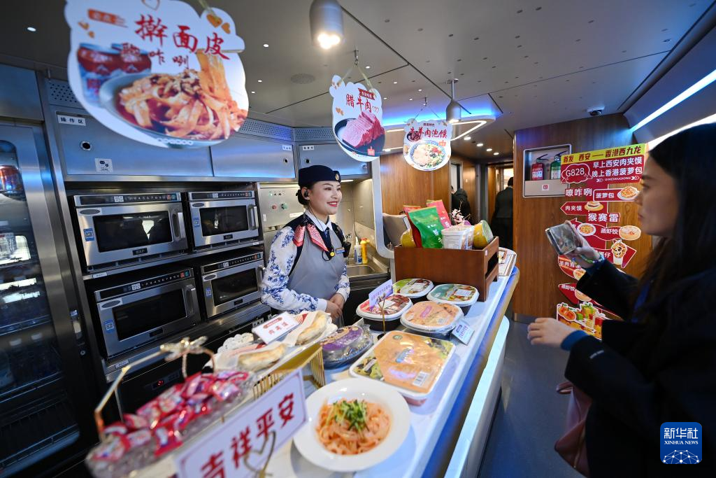 1月5日,擔當陜港列車值乘任務的“長安之馨”西港乘務人員為旅客介紹餐車服務情況。
