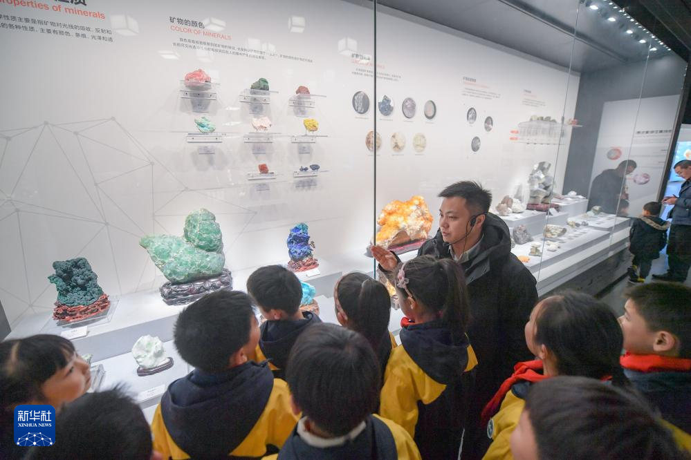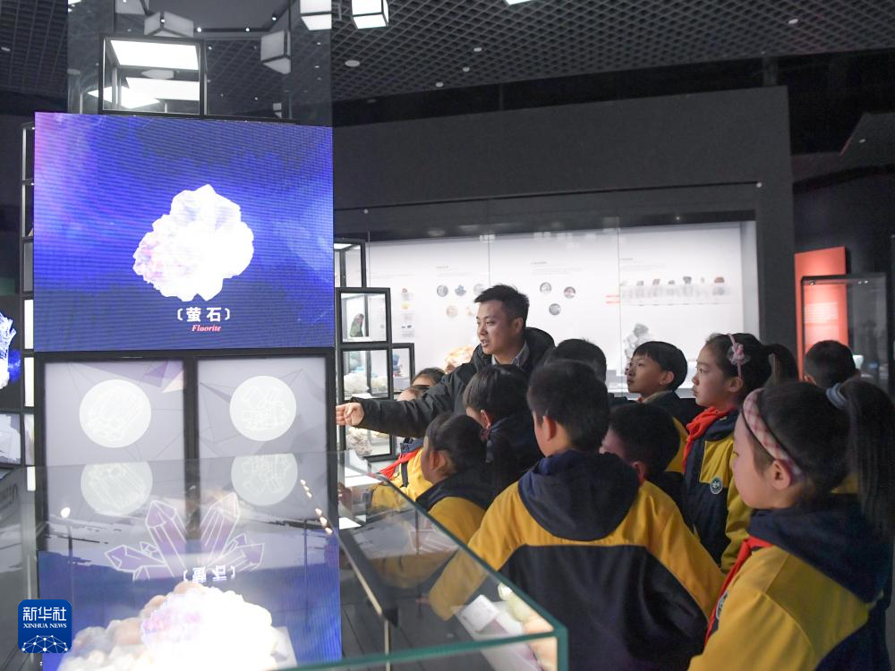 在成都理工大學博物館,鄒灝(后)在給成都理工大學附屬小學四年級的學生講解螢石礦的特點(2025年1月12日攝)。