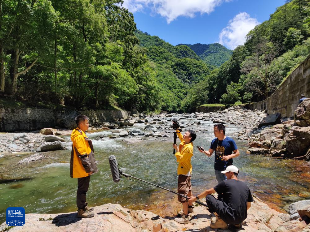 鄒灝(左一)在四川巴中光霧山錄制科普視頻(2020年6月29日攝)。