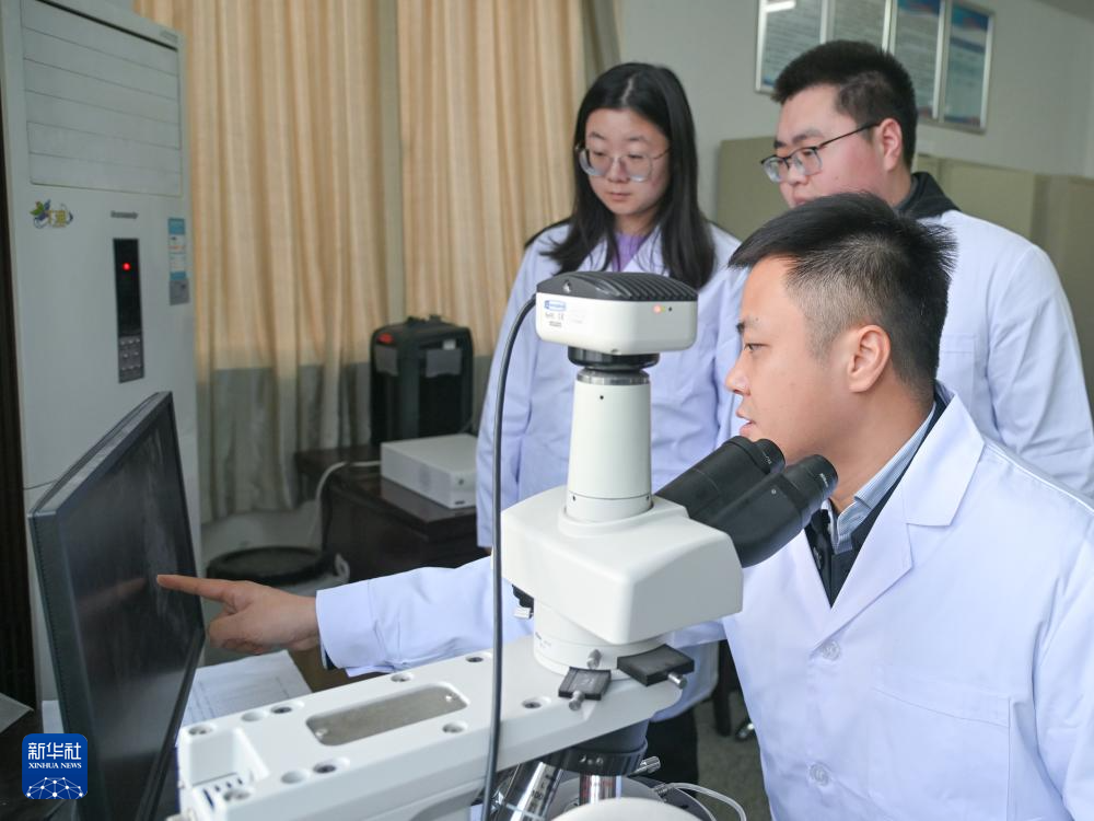 在成都理工大學地球與行星科學學院實驗室,鄒灝(前)與學生討論流體包裹體的特征(2024年11月27日攝)。