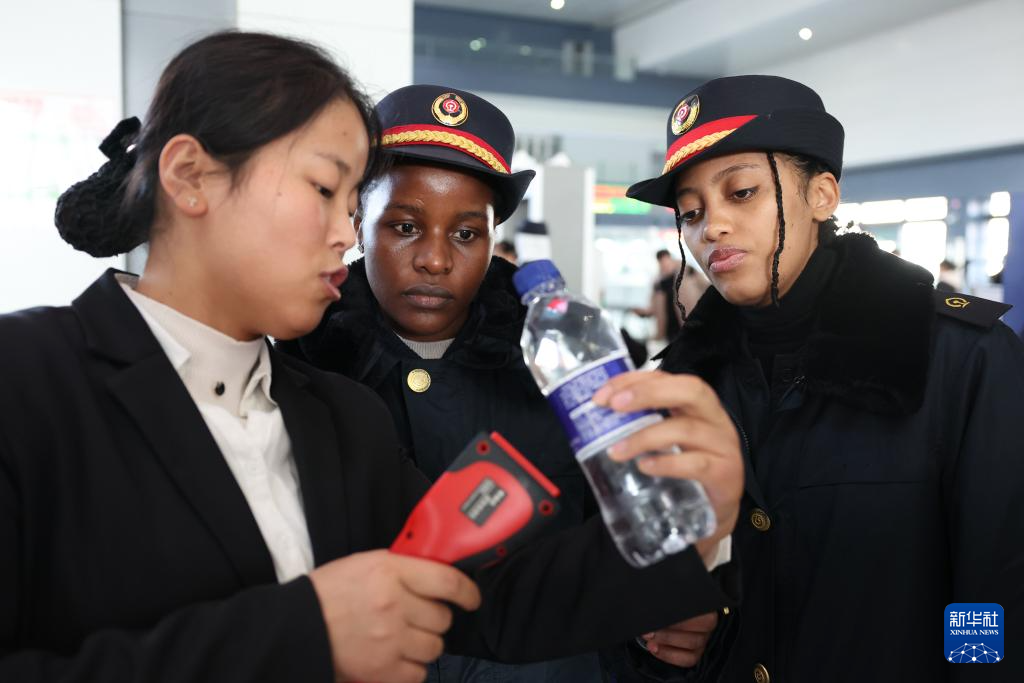 1月18日,來自肯尼亞的志愿者薩娜(中)和來自馬達加斯加的志愿者劉珍芯(右)在蘭州西站工作人員的指導下學習安檢工作。