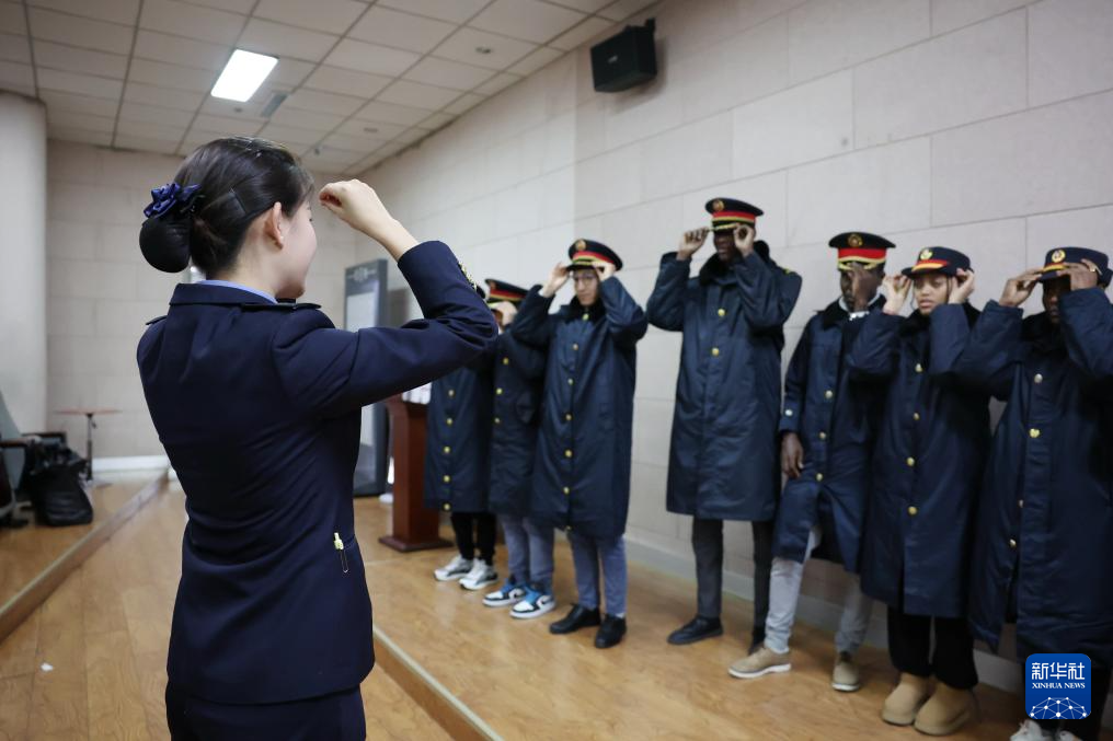 1月18日,外國志愿者在蘭州西站客運員(前左)的指導下穿上鐵路制服準備上崗。