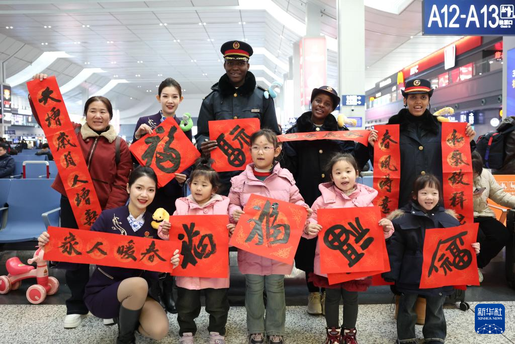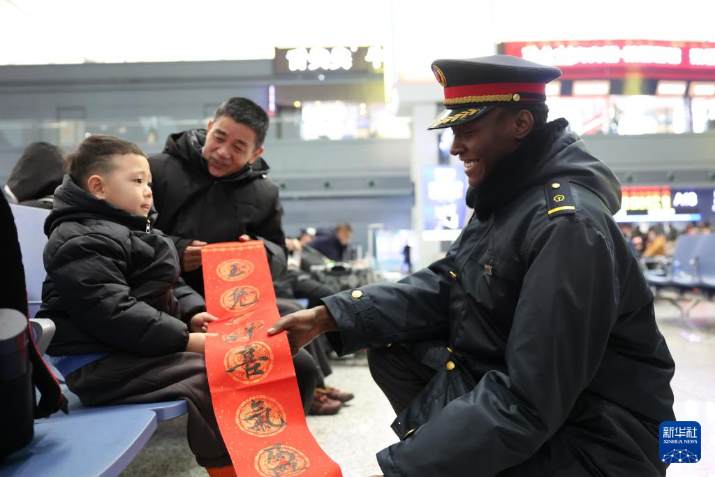 1月18日,來自乍得的志愿者卡爾貝(右一)在蘭州西站候車廳內給一名小朋友送上春聯和祝福。