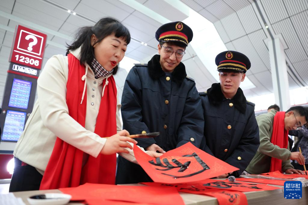1月18日,來自阿富汗的志愿者李想(中)在蘭州西站候車廳和書法愛好者一起為旅客寫新春祝福。