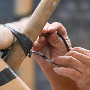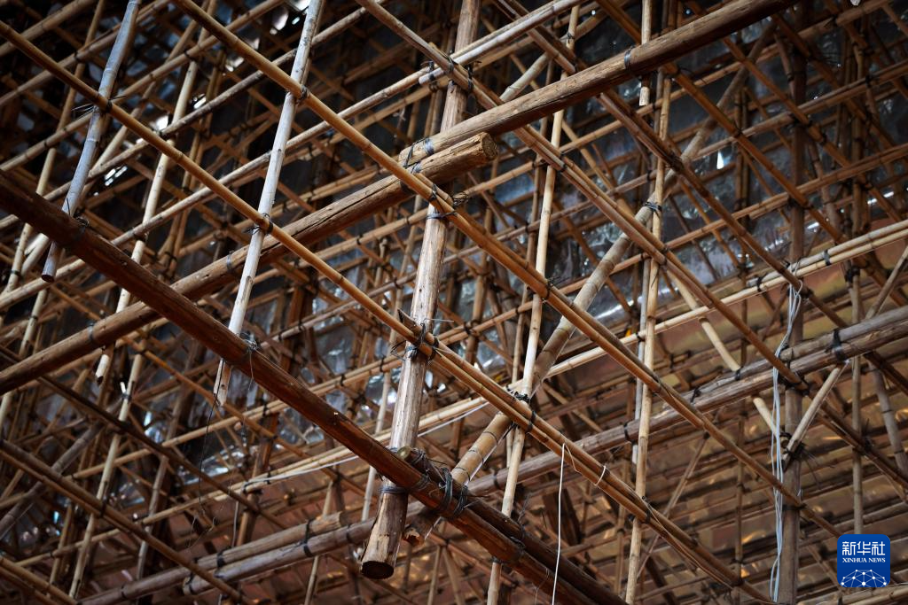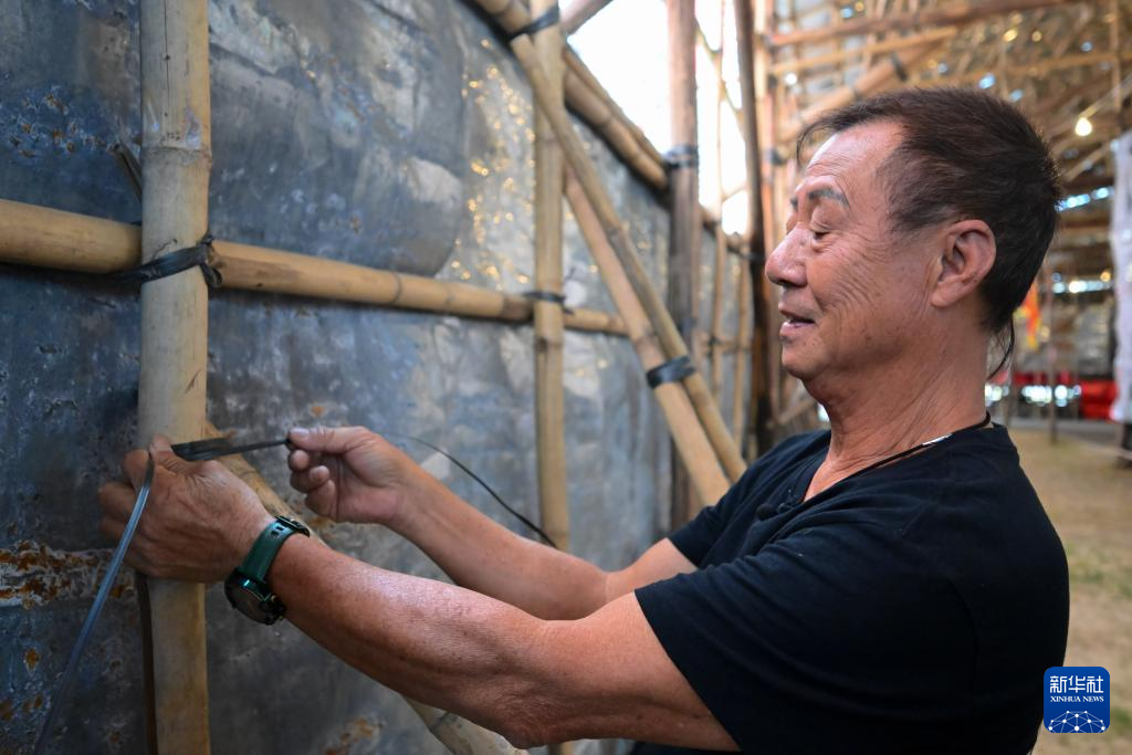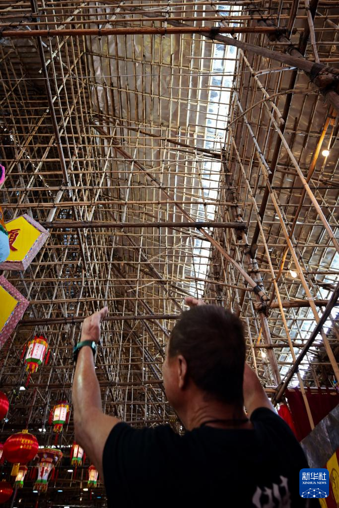 陳煜光在香港元朗廈村鄉展示戲棚搭建技藝(2024年11月11日攝)。
