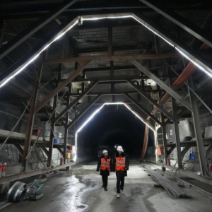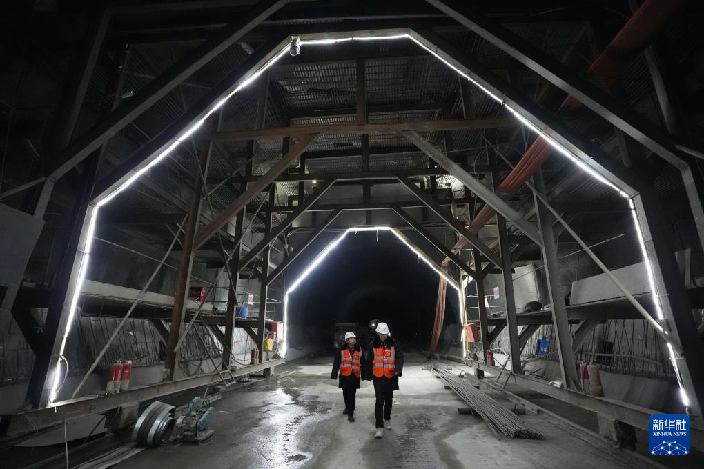 1月25日,工作人員在濱綏鐵路綏芬河至國境線擴能改造工程隧道中前行,準備開展監測作業。