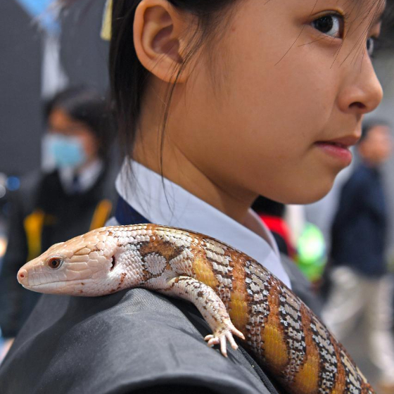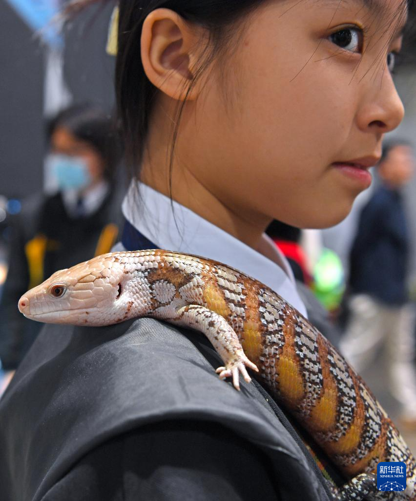2月6日,在香港會議展覽中心,參展商展示一只藍舌石龍子。