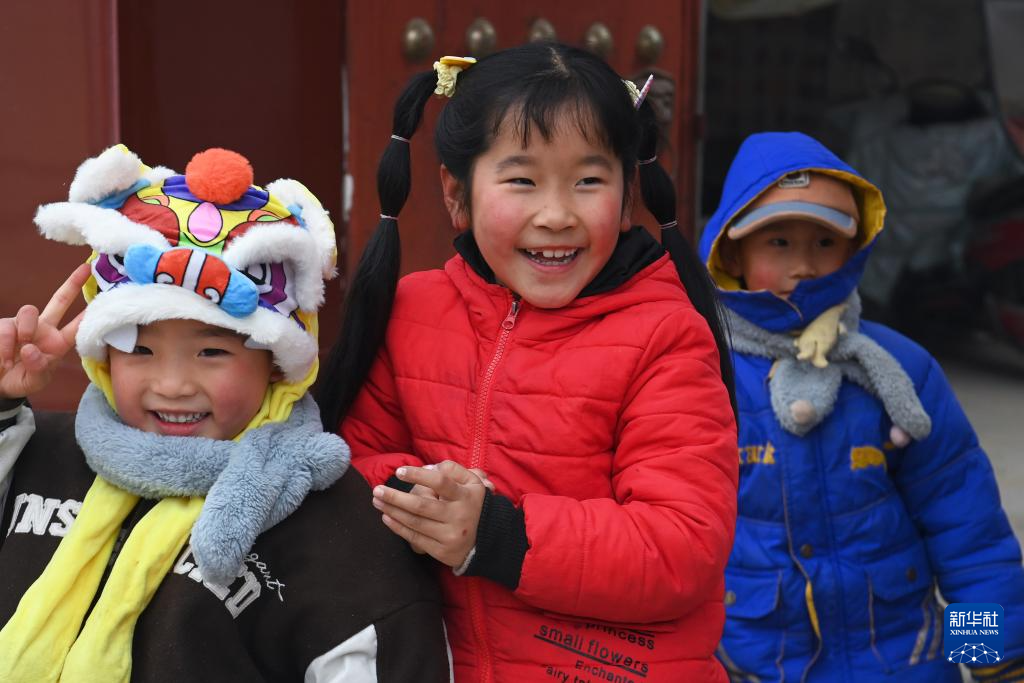 2月11日上午,黃花峪村的小朋友在家門口觀看馬社火游演。