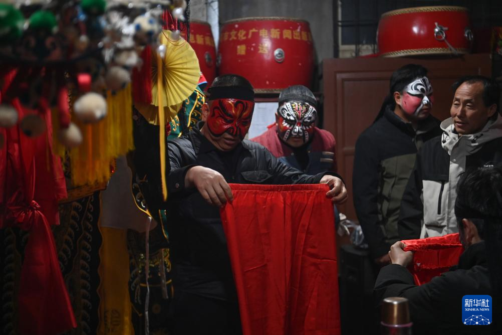 2月11日凌晨,黃花峪村社火隊成員在整理演出服飾。