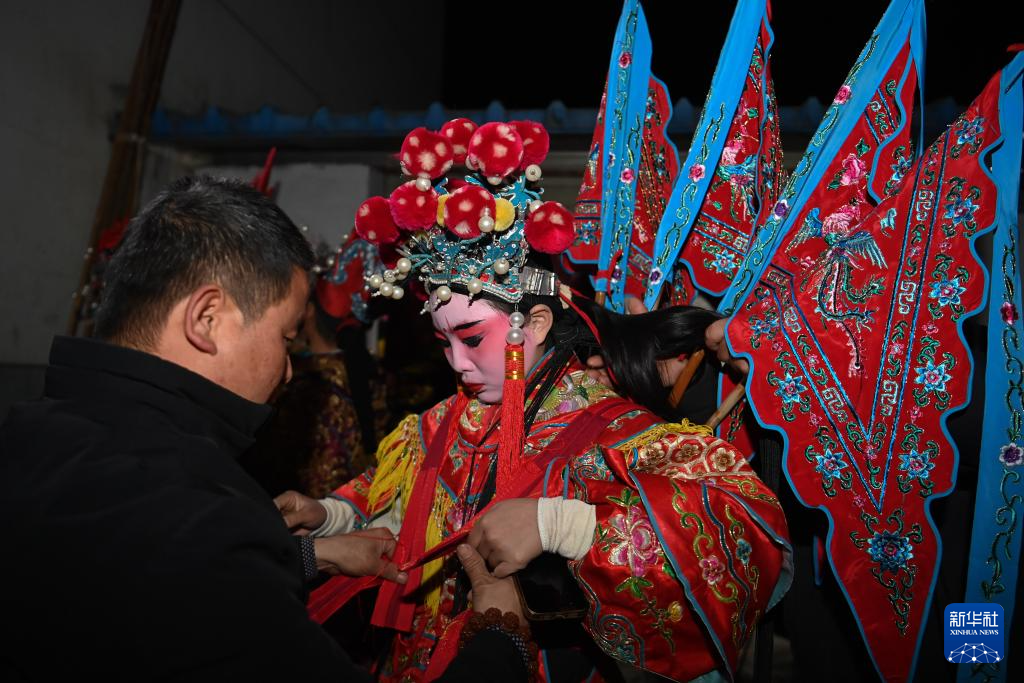 2月11日凌晨,村民為黃花峪村社火隊成員穿戴演出服飾。