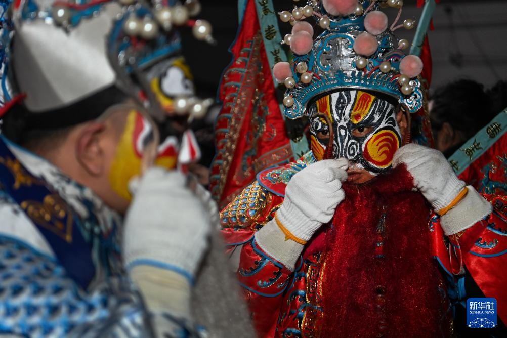 2月11日凌晨,黃花峪村的臉譜手藝人為社火隊成員繪制臉譜。