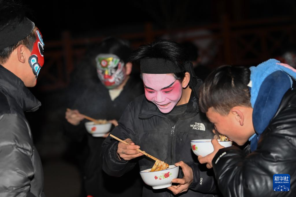 2月11日凌晨,黃花峪村社火隊成員在吃早餐。