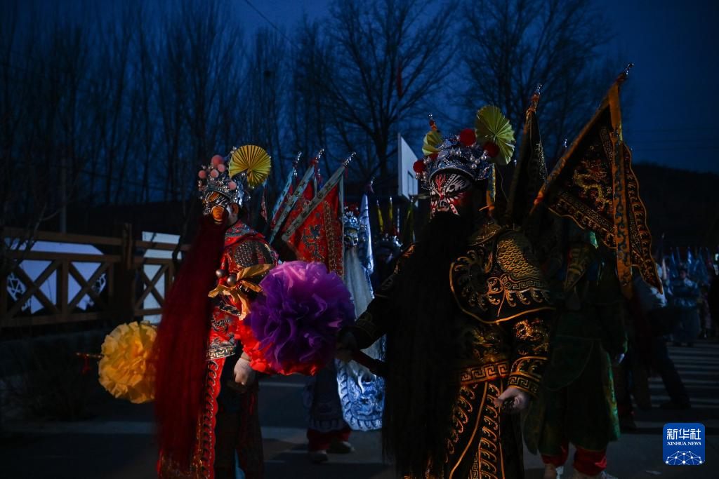 2月11日凌晨,黃花峪村村支書田濤在組織社火隊排隊出發。