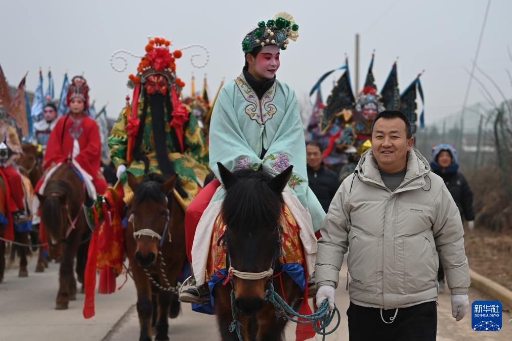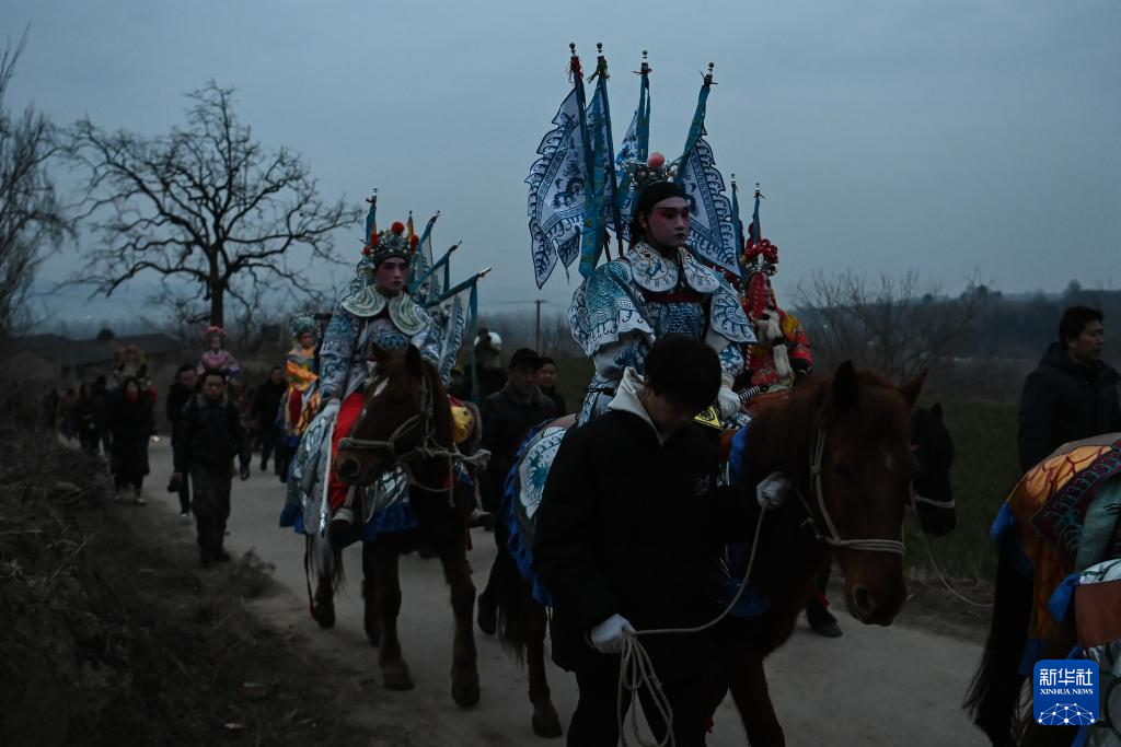 2月11日清晨,黃花峪村社火隊在進廟敬神途中。
