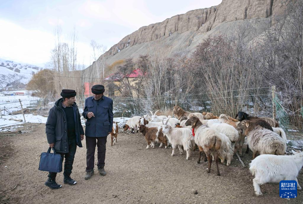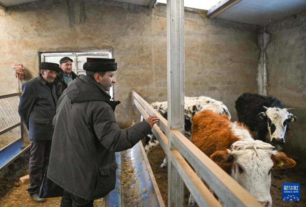 在新疆喀什地區塔什庫爾干塔吉克自治縣瓦恰鄉夏布孜喀拉村,多來提曼·開米克在一戶村民的棚圈中實地了解牲畜越冬情況(2025年1月3日攝)。