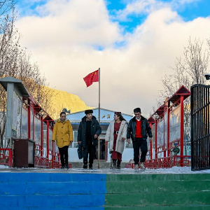 在新疆喀什地區塔什庫爾干塔吉克自治縣瓦恰鄉夏布孜喀拉村,多來提曼·開米克(左二)和同事走出村委會大門,準備到村民家中走訪(2025年1月3日攝)。