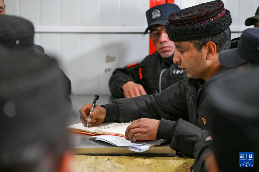 在中國-塔吉克斯坦邊境地區的一處執勤點,多來提曼·開米克(右)與護邊員交流時記錄護邊員的反饋(2025年1月9日攝)。