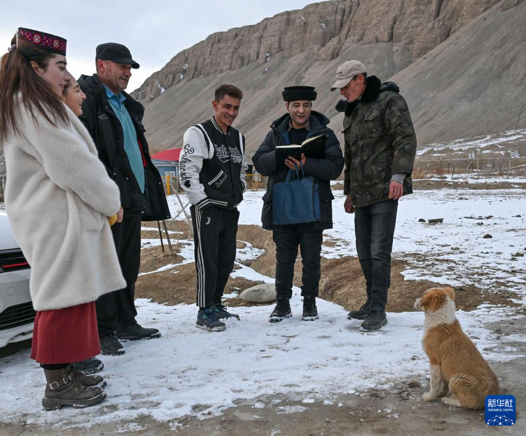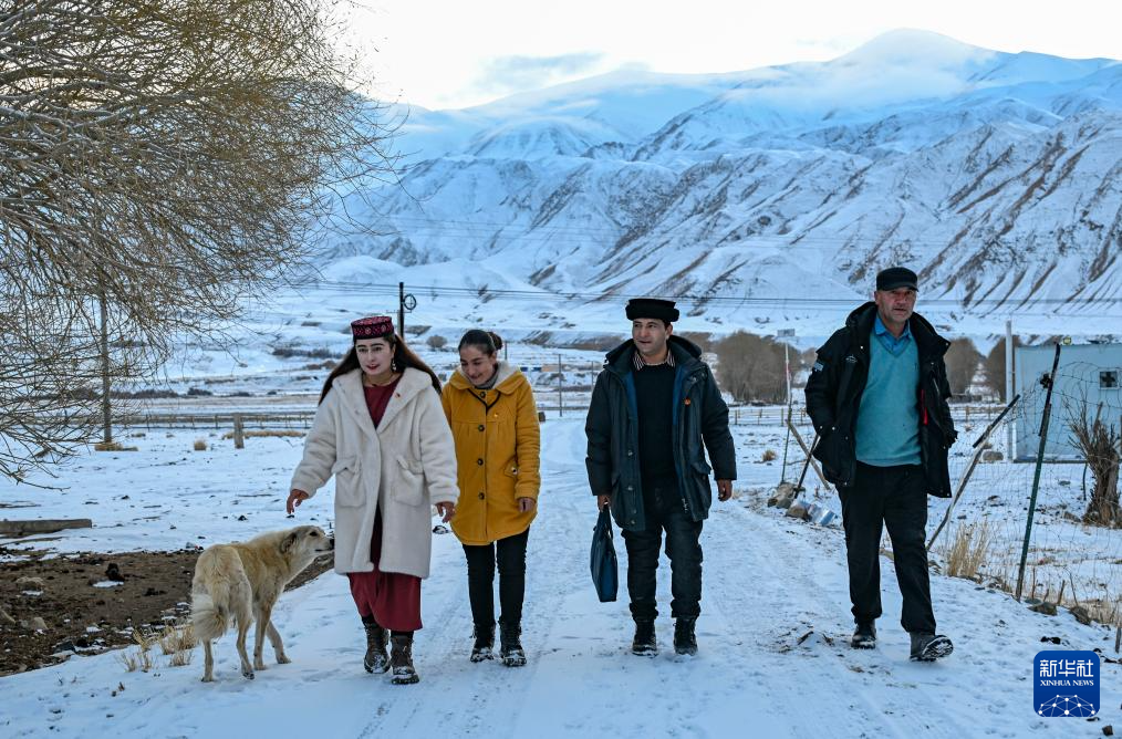 在新疆喀什地區塔什庫爾干塔吉克自治縣瓦恰鄉夏布孜喀拉村,多來提曼·開米克(右二)在村里走訪(2025年1月3日攝)。