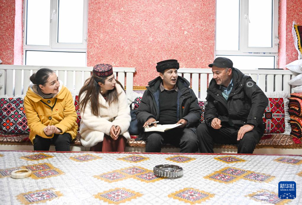 在新疆喀什地區塔什庫爾干塔吉克自治縣瓦恰鄉夏布孜喀拉村,多來提曼·開米克(右二)在牧家樂經營主帕爾吾尼克·吾地那(右一)家中調研,聽取他對鄉村旅游發展的意見建議(2025年1月3日攝)。