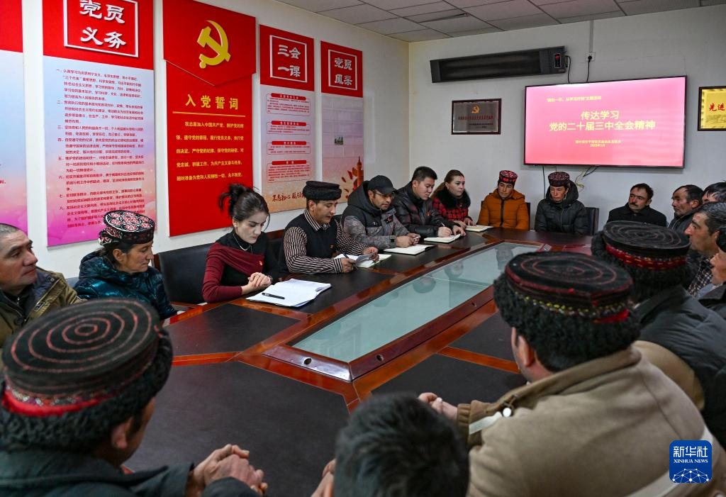 多來提曼·開米克在新疆喀什地區塔什庫爾干塔吉克自治縣瓦恰鄉夏拉夫迭村宣講黨的二十屆三中全會精神(2025年1月4日攝)。