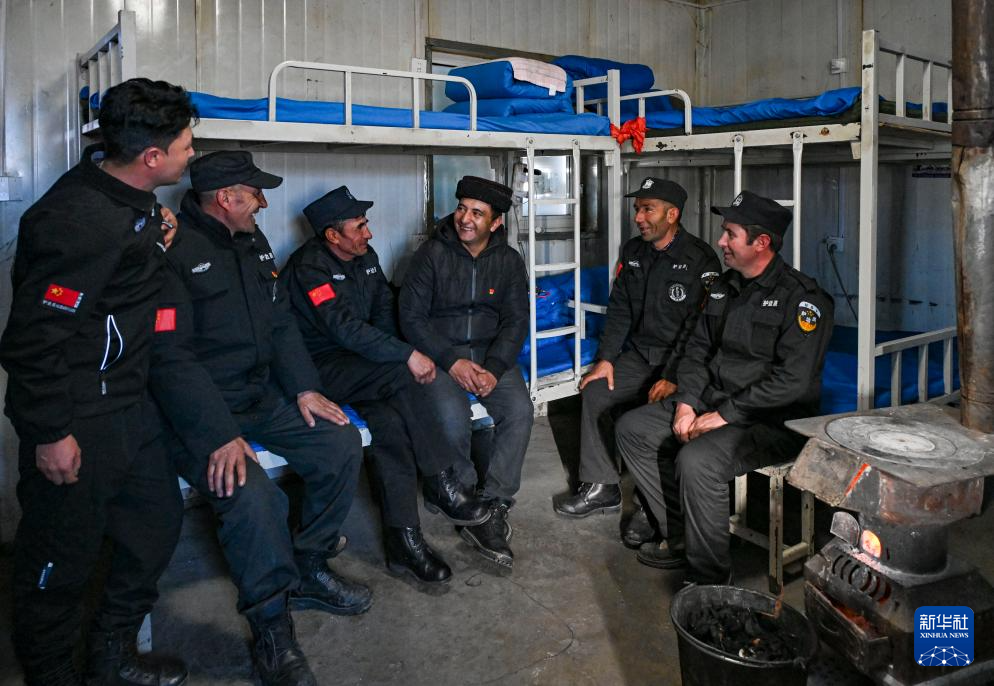 在中國-塔吉克斯坦邊境地區的一處執勤點,多來提曼·開米克(右三)同本村護邊員交流(2025年1月9日攝)。