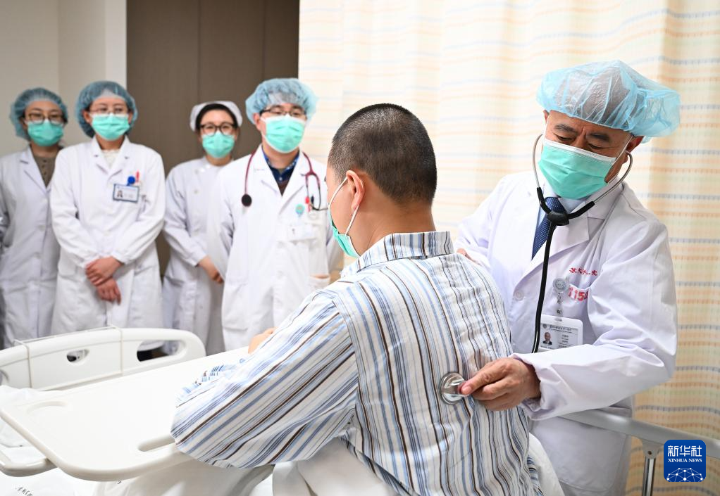 在蘇州大學附屬第一醫院血液科,吳德沛在病房查房時給患者檢查(2025年2月17日攝)。