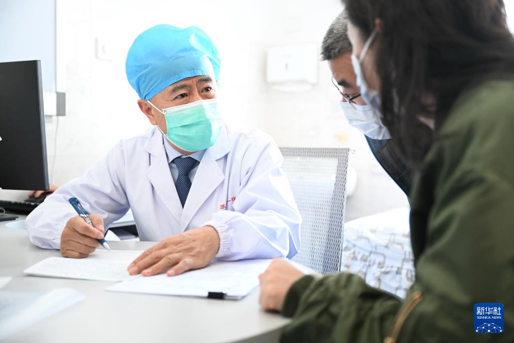 在蘇州大學附屬第一醫院血液科,吳德沛和門診患者家屬交談(2025年2月18日攝)。