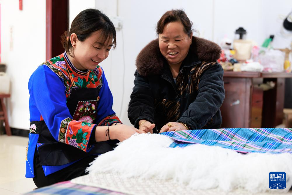 在鎮寧布依族苗族自治縣六馬鎮致富村,盧丹(左)和村民盧成敏一起編織民族特色布匹(2025年2月20日攝)。
