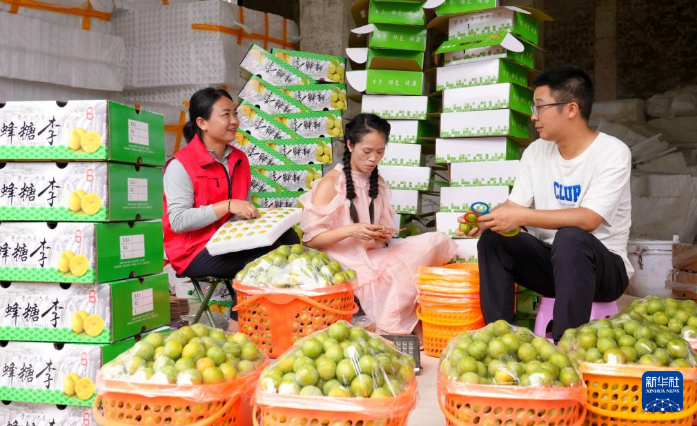在鎮寧布依族苗族自治縣六馬鎮致富村,盧丹(左)和村民一起包裝蜂糖李(2024年6月26日攝)。