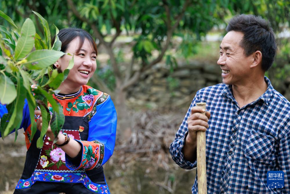 在鎮寧布依族苗族自治縣六馬鎮致富村,盧丹(左)與村民劉發志交流芒果種植情況(2025年2月20日攝)。