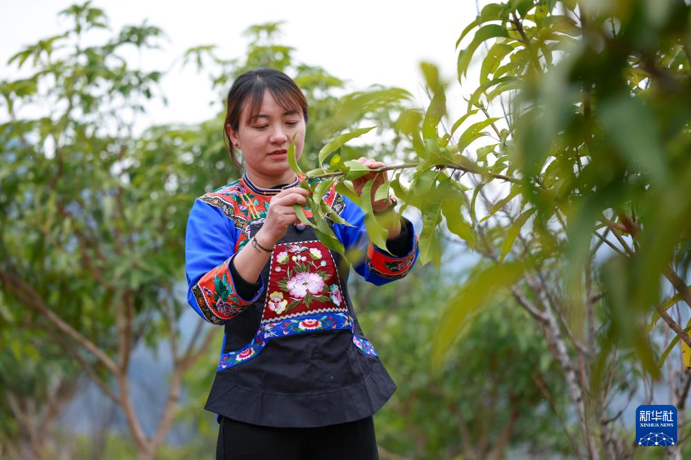 在鎮寧布依族苗族自治縣六馬鎮致富村,盧丹查看芒果樹生長情況(2025年2月20日攝)。